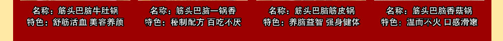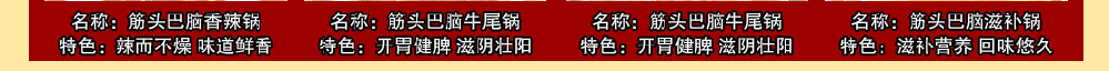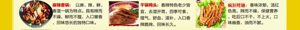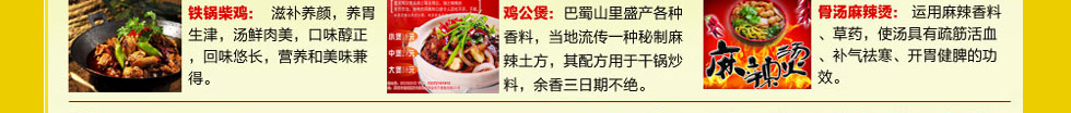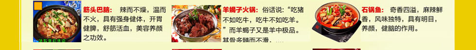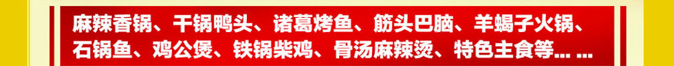 (筋頭巴腦 梭邊魚 羊蝎子火鍋 麻辣香鍋 干鍋鴨頭 鐵鍋柴雞 雞公煲 石鍋魚 諸葛烤魚 三汁燜鍋 )