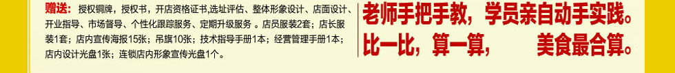 2、專業(yè) 老師上門帶店1-4周;確保連鎖店火爆開業(yè)。上門培訓(xùn)、廚師配送、跟班實(shí)操、服務(wù)員招聘及培訓(xùn)、經(jīng)營成本核算;