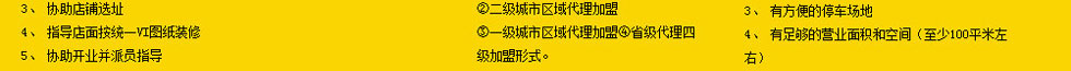 開店標(biāo)準(zhǔn) 1、二開間以上門面(60-250平方米)、周邊一公里內(nèi),無我公司加盟店。